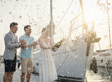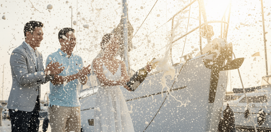 The heart of the ritual: a short invocation, a few words to the gods of the sea and wind, and the glorious crack of glass of champagne. We handle every step, ensuring good humour, good form, and good fortune